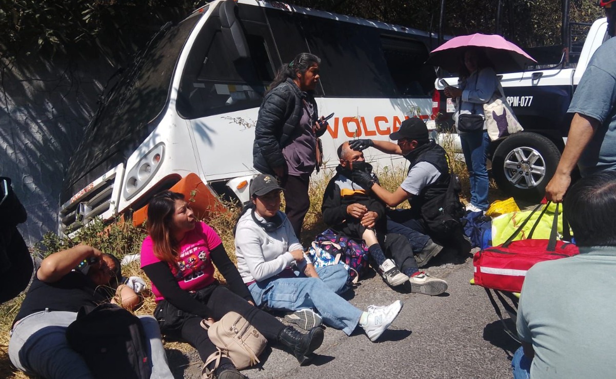Un camión de pasajeros de la línea Volcanes con aproximadamente 34 personas a bordo, cayo esta tarde en una zanja en la carretera federal México-Cuautla, a la altura del paraje “los árboles de navidad”, en los límites con Amecameca.