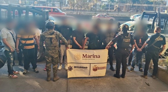 Elementos de la Policía Municipal de Ecatepec, en coordinación con la Secretaría de Marina, detuvieron a 10 personas señaladas por hacerse pasar por agentes de la por agentes de investigación para extorsionar a una pareja. Tres de los implicados portaban armas de fuego, chalecos antibalas con insignias oficiales.