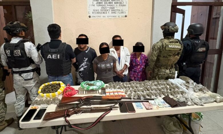 Como resultado del primer operativo, realizado en un domicilio ubicado en la población de Pueblo Viejo, municipio de Santiago Ixtayutla, distrito de Jamiltepec, se logró la detención de una mujer identificada como C.Q.R., así como el aseguramiento de decenas de bolsas que contenían hierba seca con las características de la marihuana, así como elementos balísticos, cartuchos útiles, teléfonos celulares y dinero en efectivo.