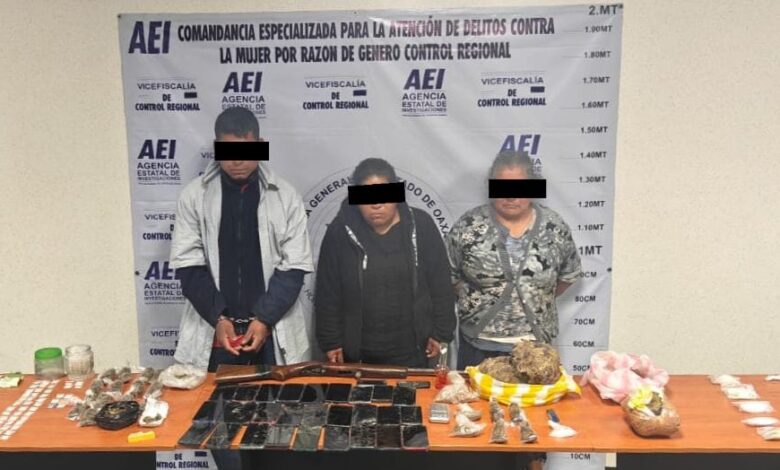 Como resultado de la primera intervención, que se llevó a cabo en un inmueble ubicado sobre el camino de terracería que comunica de Ixtlán de Juárez al mirador Cuachirindoo, detuvieron a tres personas, dos mujeres identificadas como E.O.V. (40 años) y C.O.V. (63 años), así como de un hombre identificado como A.M.M. (24 años).