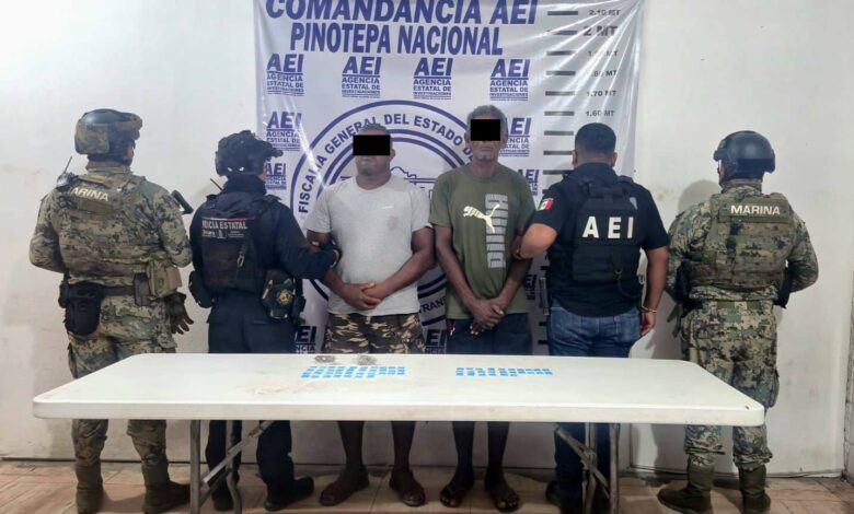 La Fiscalía General del Estado de Oaxaca (FGEO) en coordinación con fuerzas de seguridad federal y estatal, realizó la detención de dos personas del sexo masculino identificados como A.S.M., y P.C.R., alias “Pantaleón”, por delitos contra la salud, quienes estarían relacionados con una célula delictiva dedicada a la venta de drogas, que opera en la localidad de El Ciruelo, en Santiago Pinotepa Nacional.
