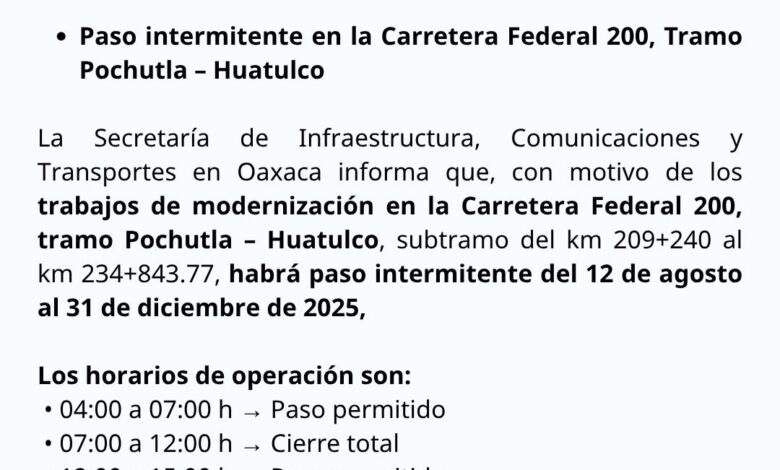 Del 12 de agosto al 31 de diciembre de 2025 habrá paso intermitente en la Carretera Federal 200, Tramo Pochutla – Huatulco (km 209+240 al km 234+843.77) por trabajos de modernización.