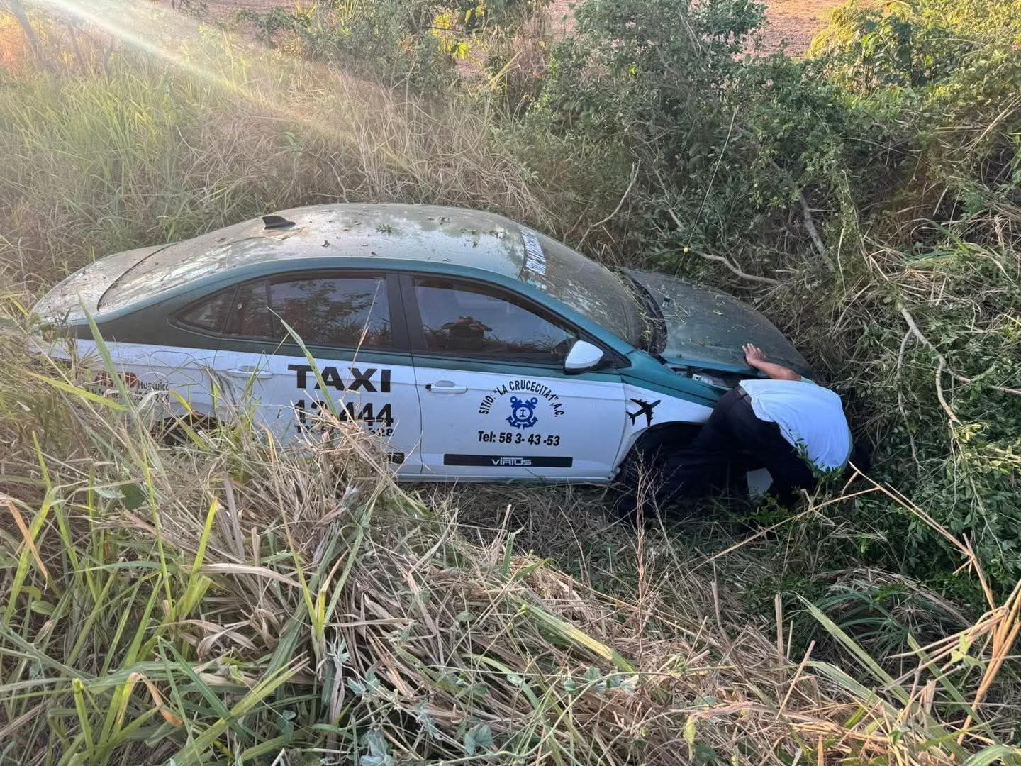 La mañana de este miércoles, el conductor de un taxi del Sitio “La Crucecita” con número económico 12 444, perdió el control de su unidad y se salió de la cinta asfáltica para caer en un barranco sobre la carretera federal 200, a la altura de Escobilla.